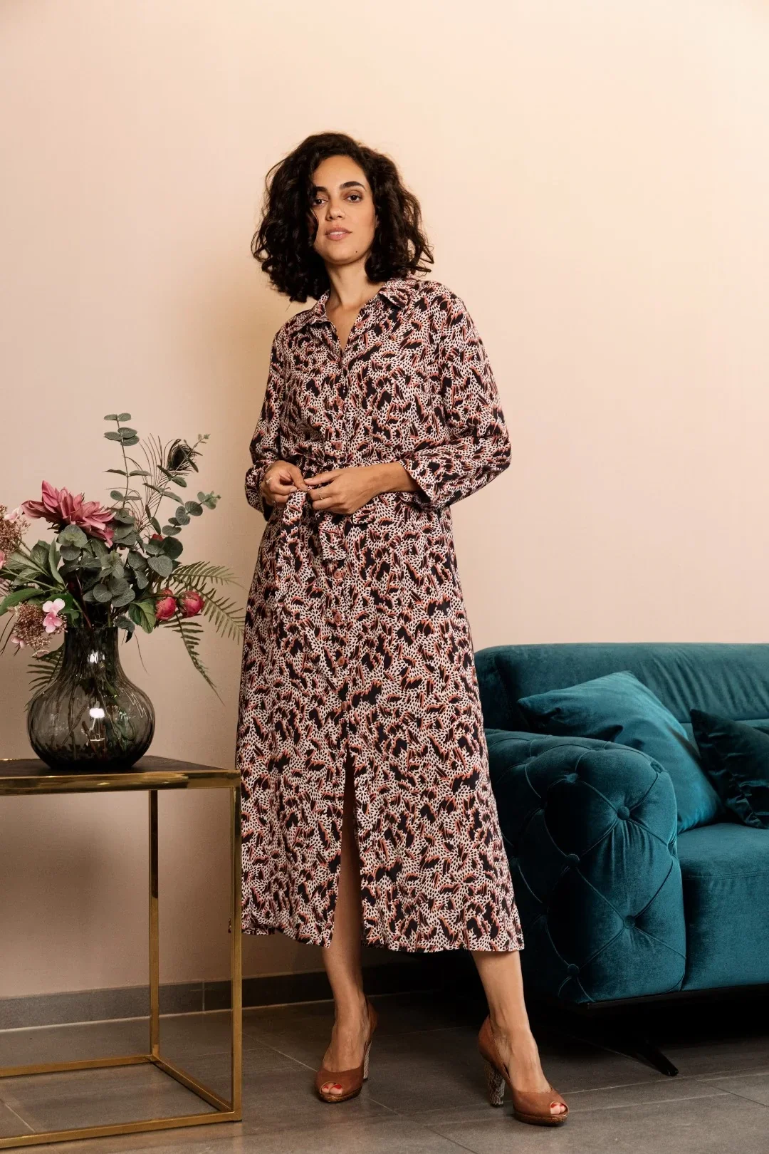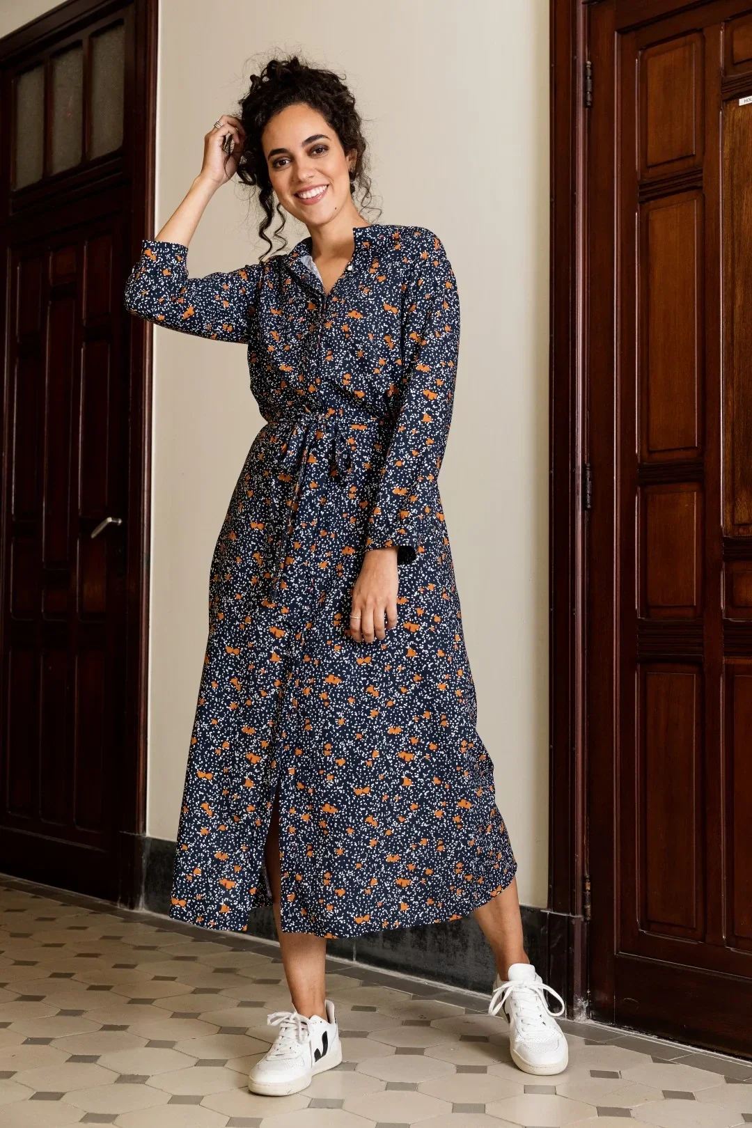 Tilde is een elegante hemdsjurk met gefronst rugpad en zwierige rok. De mouwen hebben een 4/5e lengte en zijn gefronst aan het mouwbandje. Je kan de jurk maken met een gewoon knopenpad of, voor de meer ervaren naaisters, met een verborgen knopenpad. Voor de kraag heb je 2 opties: een hemdskraag of een officierskraagje. De jurk tailleer je met een lint.